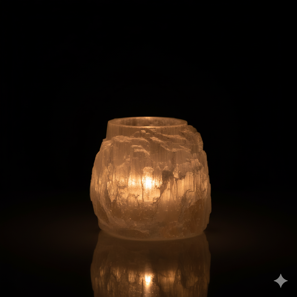 One of the most captivating features of this piece is its glow. Even when the candle is not lit, the selenite catches natural sunlight, giving off a soft, luminous effect. When a tea light is placed inside, it creates a warm and peaceful ambiance, perfect for relaxation.
